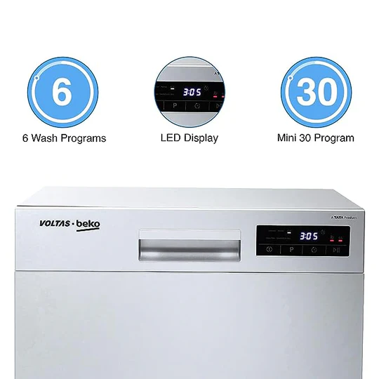 You can add ease to your kitchen chores with the Voltas Beko DT8B Dishwasher. Its small and compact size makes it a suitable addition to your kitchen. Featuring up to six wash programmes, this dishwasher effortlessly washes different dishes including your glass utensils. Also, its Clean and Shine programme can wash and dry your slightly stained dishes in a hassle-free manner. Furthermore, this dishwasher is integrated with an Intensive 70ºC function that cleans your dishes with high-temperature water jets.