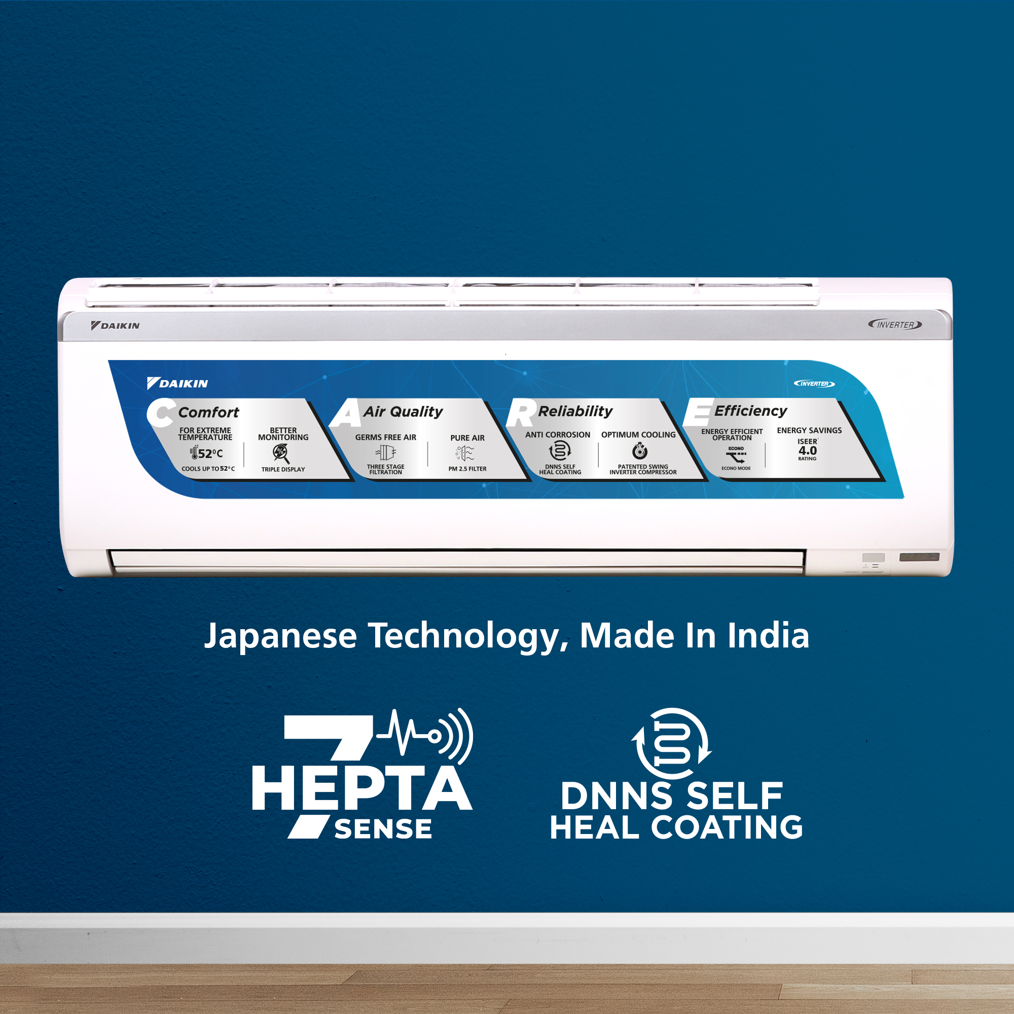 Experience cooling satisfaction with the FTKC50, designed to provide you a unique comfort experience tailored to any lifestyle. Its innovative Coanda airflow feature creates a distinct airflow pattern, ensuring optimal cooling throughout your room. With features like DNNS Self Heal Coating & Hepta Sense this AC offers unparalleled reliability & convenience